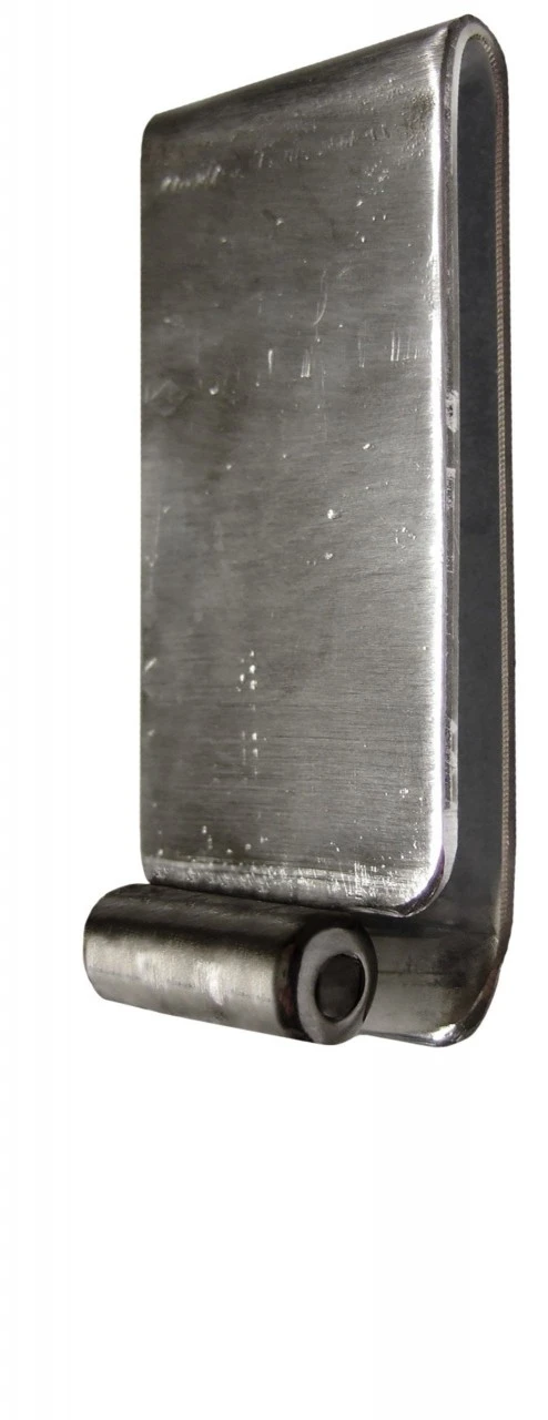 Af rustfri stål. Til at sætte på bælter . Mål: 70 X 30 mm. Befæstnings øje Ø 6 X 10 mm bredt. Vægt 35 g.