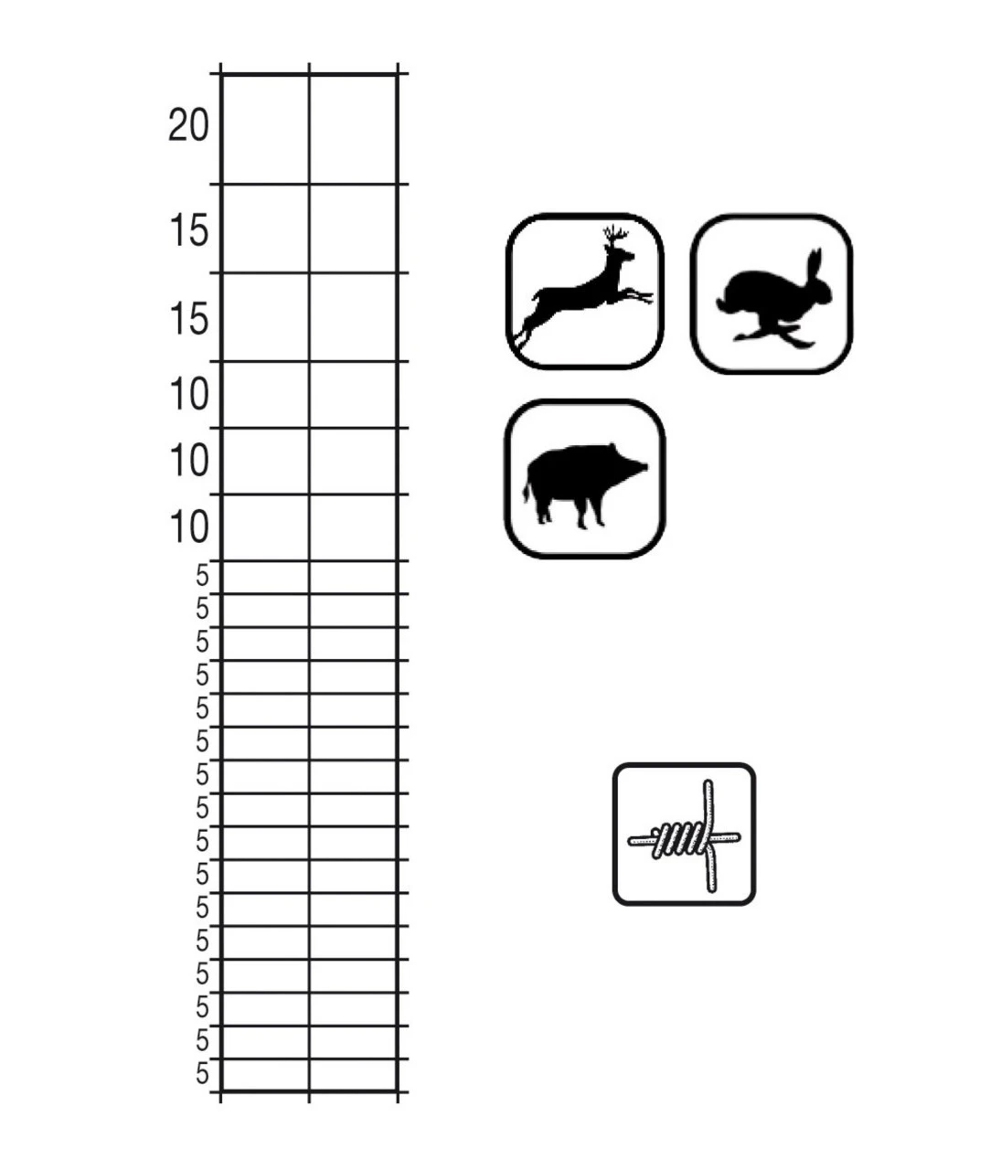 | Horisontaltrådenes afstand nedefra og op | 16 x 5 cm 3 x 10 cm 2 x 15 cm 1 x 20 cm |