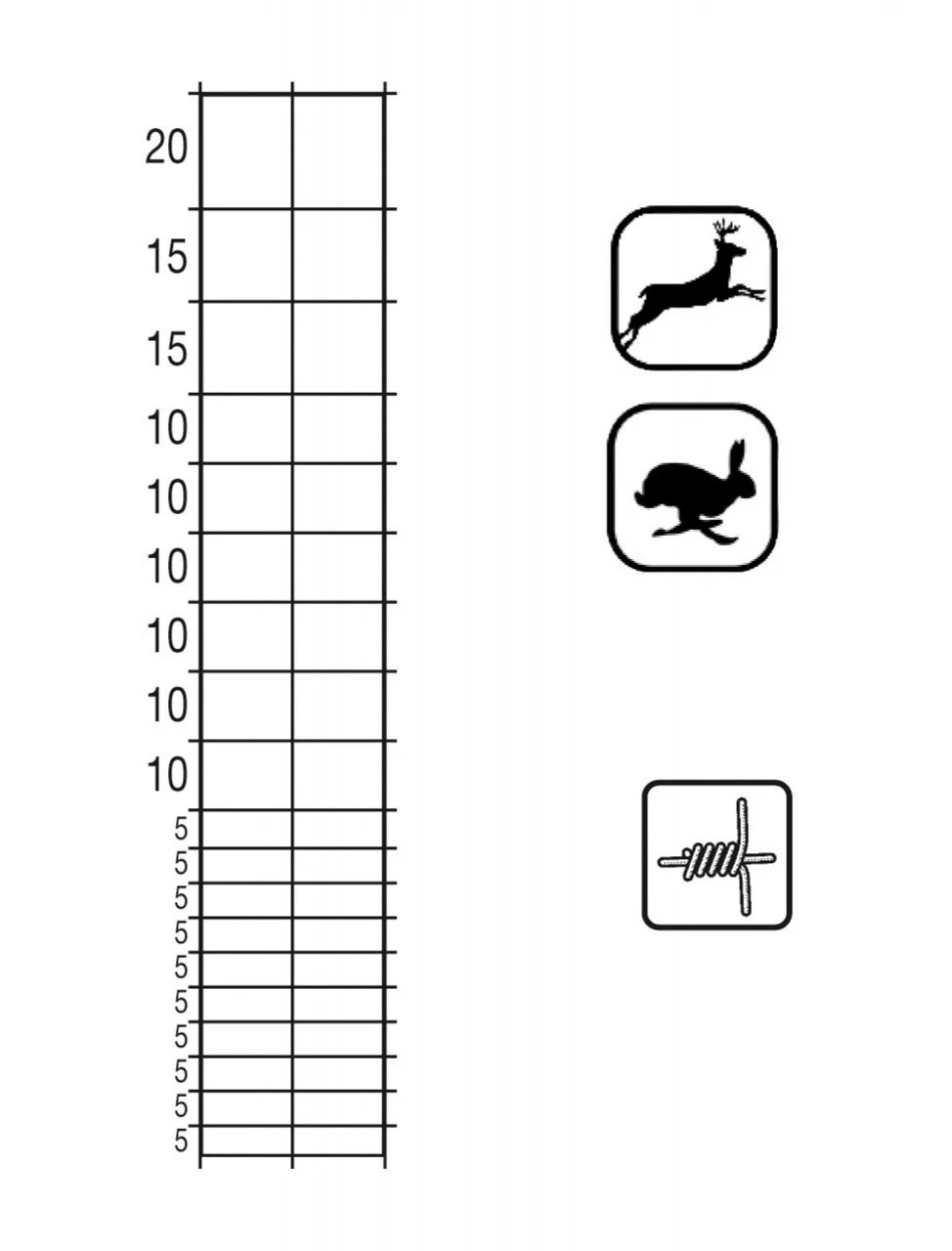 | Horisontaltrådenes afstand nedefra og op | 10 x 5 cm 6 x 10 cm 2 x 15 cm 1 x 20 cm |