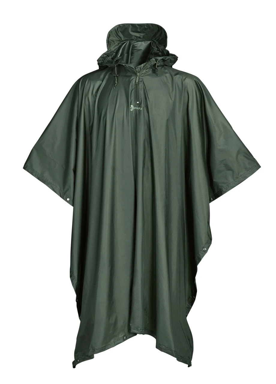 Let, uforet regnponcho – vindtæt og vandtæt med tapede sømme. Optimal bevægelsesfrihed og skridsikkerhed, fx i stejlt terræn, med justerbar længde for- og bag. Kan knappes help op i siden og bruges som presenning – mål ca. 1,40 x 2,70 m. Justerbar stormhætte. Med en lille pakkepose. Farve jagtgrøn. En størrelse.